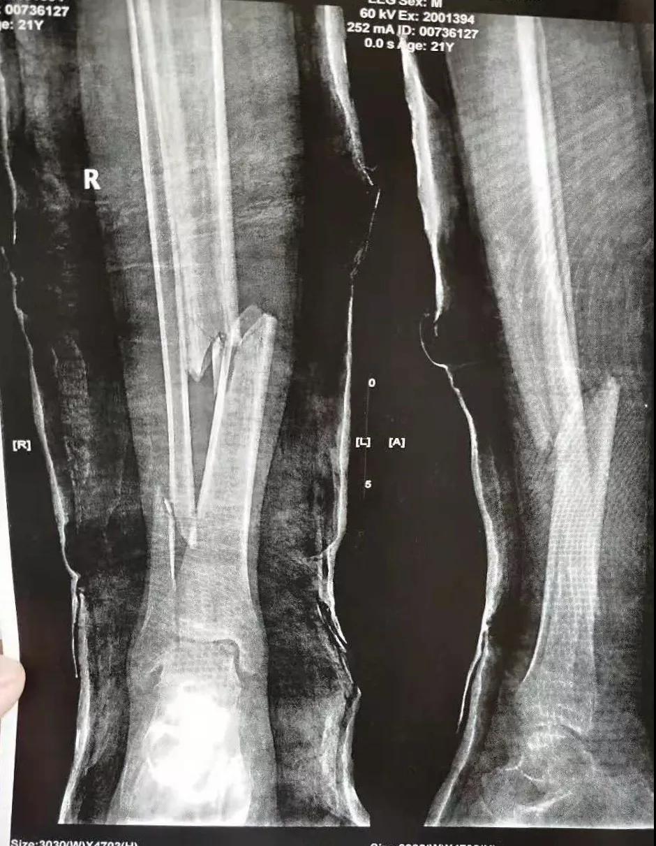 这名21岁的男性患者一个月前因车祸致伤,在当地某三甲医院确诊为右胫腓骨粉碎性骨折,骨折移位明显,建议手术治疗,因既往患严重慢性再生障碍性贫血病史16年,一般状况差,需长期输注血液制品维持三系细胞水平,麻醉及手术风险极高。虽经当地积极内科治疗,患者一般状况仍差,无法耐受手术治疗。患者及家属经多方打听,抱着最后一丝希望来到色花堂 骨二科求治。