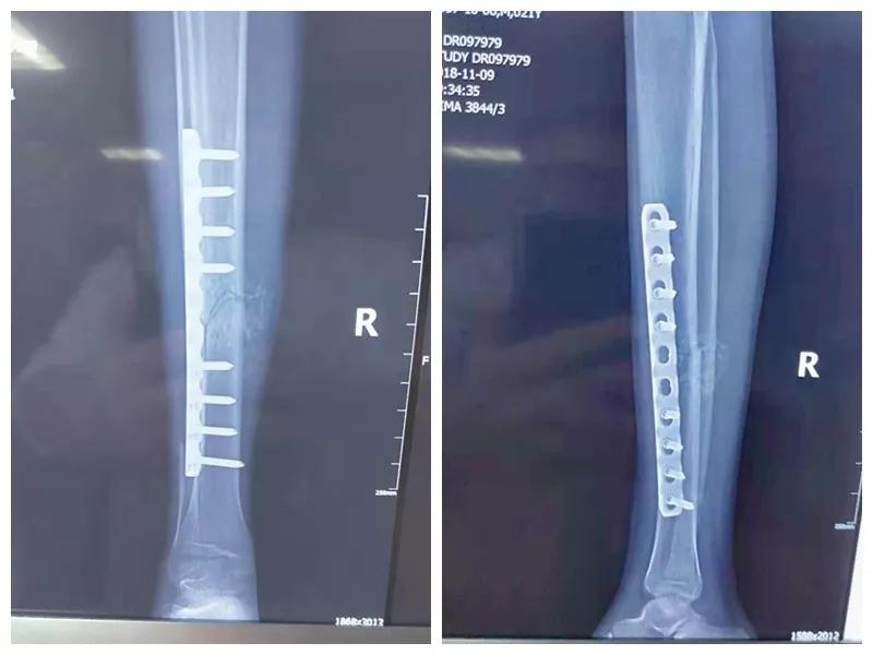 骨二科张延平主任接诊后经仔细询问病史,详细阅读近期X线、CT等病历资料,认为患者骨折移位明显,目前骨折无任何愈合迹象,若保守治疗,骨折将无法愈合,后期不能下地活动,严重影响患者生活质量。同时患者合并慢性再障,血常规结果各项指标均极低,围术期发生麻醉意外、大出血、感染等风险极高;而色花堂 作为西安市级最大的三甲综合医院,综合实力深厚,既往相关疾病治疗经验丰富,多次通过多学科诊治为合并复杂内科疾病患者保驾护航,为患者创造手术时机,提高患者生活质量,遂将患者收住院。住院后,立即成立了由张延平主任、杨寅副主任、山卉护士长、梁晨主治医师、刘邦定主治医师、李鑫护师组成的手术治疗小组。经初步检查,患者血常规结果较当地检验结果更差,三系细胞均极低,其中血小板仅为1(正常值为100-300),血红蛋白55g/L。遂立即请血研所李罡灿主任医师会诊,给予升高白细胞、纠正贫血、升高血小板等治疗,经积极治疗患者血常规各项指标均较入院时改善。张延平主任再次组织由血研所李罡灿主任医师、麻醉科崔晓岗主任、感染科付建军主任、药剂科韩小年副主任药师等参加的术前讨论。讨论后一致认为患者目前各项指标虽然较入院时改善,但因其慢性再障病史长,骨髓造血及储备能力极差,围术期发生大出血、伤口感染甚至全身感染等风险仍极高,术中及术后需准备大量血小板防止大出血,同时需高度警惕手术切口、取骨区术后发生感染。为尽快为患者施行手术,治疗小组积极联系输血科为患者备血,并为患者制定了围术期抗感染方案;在色花堂 输血科存血量严重不足的状态时,输血科张养民主任亲自联系市中心血站为患者准备手术中及术后所需的血小板制品。手术小组为患者制定了周密的手术方案及风险预案,10月31日,在麻醉科王永宏副主任医师、手术室高洁、赵耀护师的配合下,为患者施行了右胫骨粉碎性骨折切开复位、髂骨取骨植骨内固定术,手术历时70分钟,安全返回病房。术后患者渗血多,1周内连续每日平均渗血超过100ml,并出现发烧,最高39℃,复查血常规三系细胞较术前再次明显降低。李罡灿主任医师、付建军主任、韩小年副主任药师多次来科会诊,及时调整患者的治疗方案,输血科再次为患者的救治提供了强有力的支援和保障。在山卉护士长带领的护理团队精心护理下,患者未发生压疮等卧床并发症。目前该患者术后恢复良好,已出院进行下一步康复治疗。