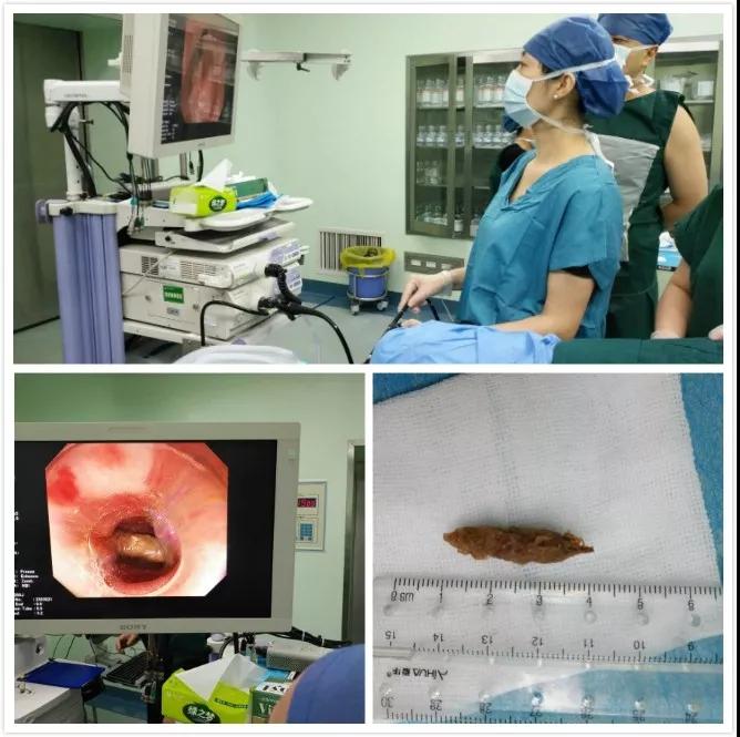 杨振威主治医师上报消化科主任庄坤主任,庄坤主任分析由于患者围产期,不能进行CT检查,无法确定枣核嵌顿位置、是否穿孔。遂紧急联系B超室郑瑜主任,行B超下检查,可见一异物嵌顿于食管入口处,所幸B超提示尚未穿孔。庄坤主任上报医务科,在医务科刘超科长的协调下,联合产科郭静主任、麻醉科崔晓岗主任、B超室郑瑜主任和手术室同仁们共同研究治疗方案。大家认为,麻醉及内镜下夹取异物虽然风险和困难依然很大,但是成功可免去开胸手术,应该是对于该孕妇最佳的治疗方案。科室决定借助内镜将枣核取出。在充分告知患者家属治疗可能带来的风险并取得同意后患者被送往手术室进行内镜下食管异物取出术,治疗由消化内科庄坤主任执镜,进镜后,医生发现了在食管上段嵌顿的枣核,两头尖端部分已经刺进食道,庄坤主任用异物钳小心夹取,凭借多年的经验和娴熟的操作技术,最终将枣核成功取出。