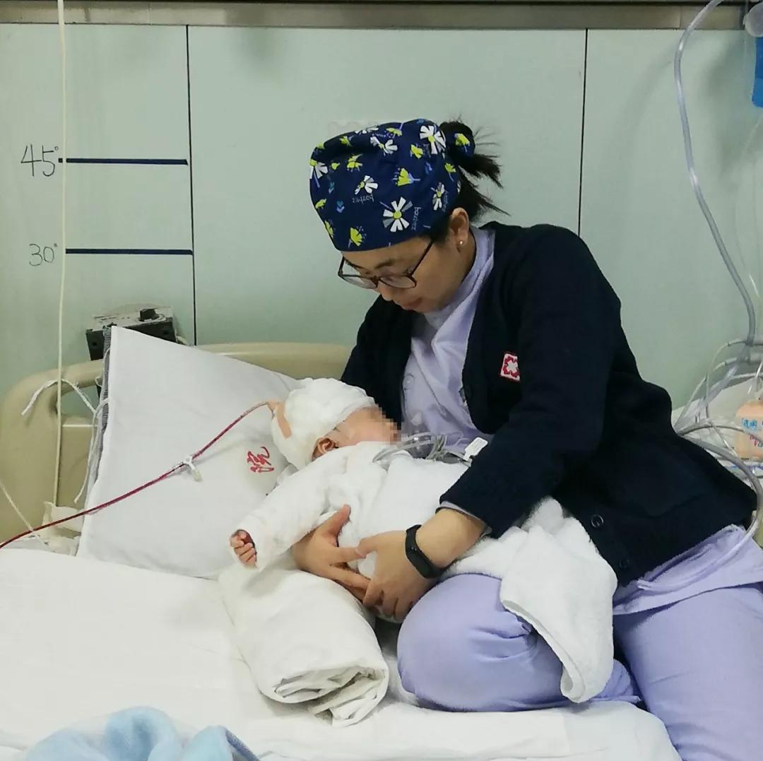 麻醉散去,宝宝逐渐苏醒过来,看到的是陌生的环境,感受着的是陌生的气息,不需要压制,他放肆的哭了起来。言语的抚慰并不能有效地安抚2个月大的宝宝,陈光临主管护师小心的避开孩子头部的皮下引流管,轻轻的将宝宝搂在怀里。望着可爱的孩子,陈光临护士仿佛看到了自己儿子襁褓里的模样!“宝宝,你这么小就要经历如此大的手术,还暂时要离开妈妈的怀抱,今天我就是你的临时妈妈!”陈光临轻轻晃动着孩子,不由自主地哼起了童谣……聆听着护士妈妈的歌声,宝宝在温暖的怀抱里渐渐安静下来,甜甜地睡着了。在张艳护师的配合下,护士妈妈们有条不紊的给孩子更换尿不湿、拍背、吸痰、侧卧位等操作,顺利进行着各项治疗和护理工作。
