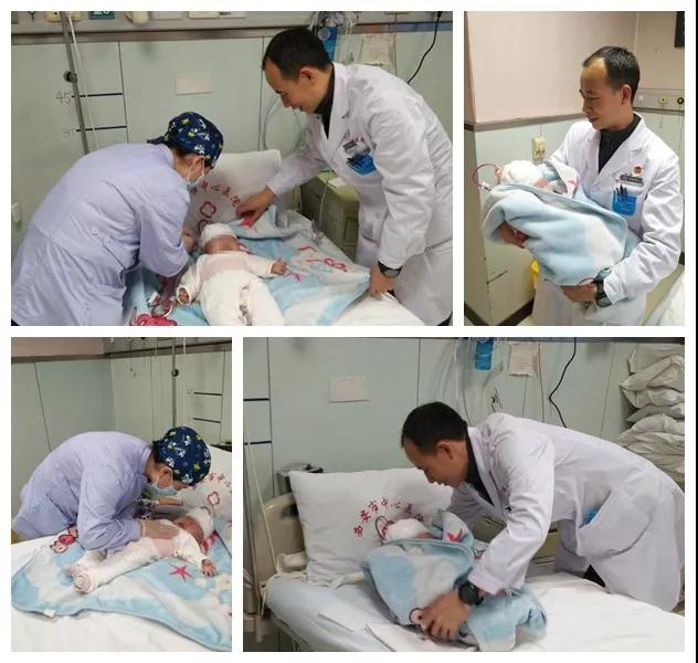 作为神经外科建科以来年龄最小的手术患儿,宝宝激发了神经外科护士们强烈的母爱。ICU里的护士妈妈们自动减轻了脚步和说话的声音,操作更加轻柔,并不时的到宝宝跟前关切的看一眼,听到孩子不安的哭声就会立即停下脚步,轻柔的拍拍或者抱在怀里给予安慰。护士妈妈们精心的护理感动了主治医生万晓强,即使工作繁忙,年近40岁的他也会挤出时间,时不时当起临时爸爸!看着他抱着孩子的样子,护士妈妈们都说这个爸爸很合格呢!经过神经外科医护的精心照顾与呵护,宝宝现在已经开始对着大家笑了。