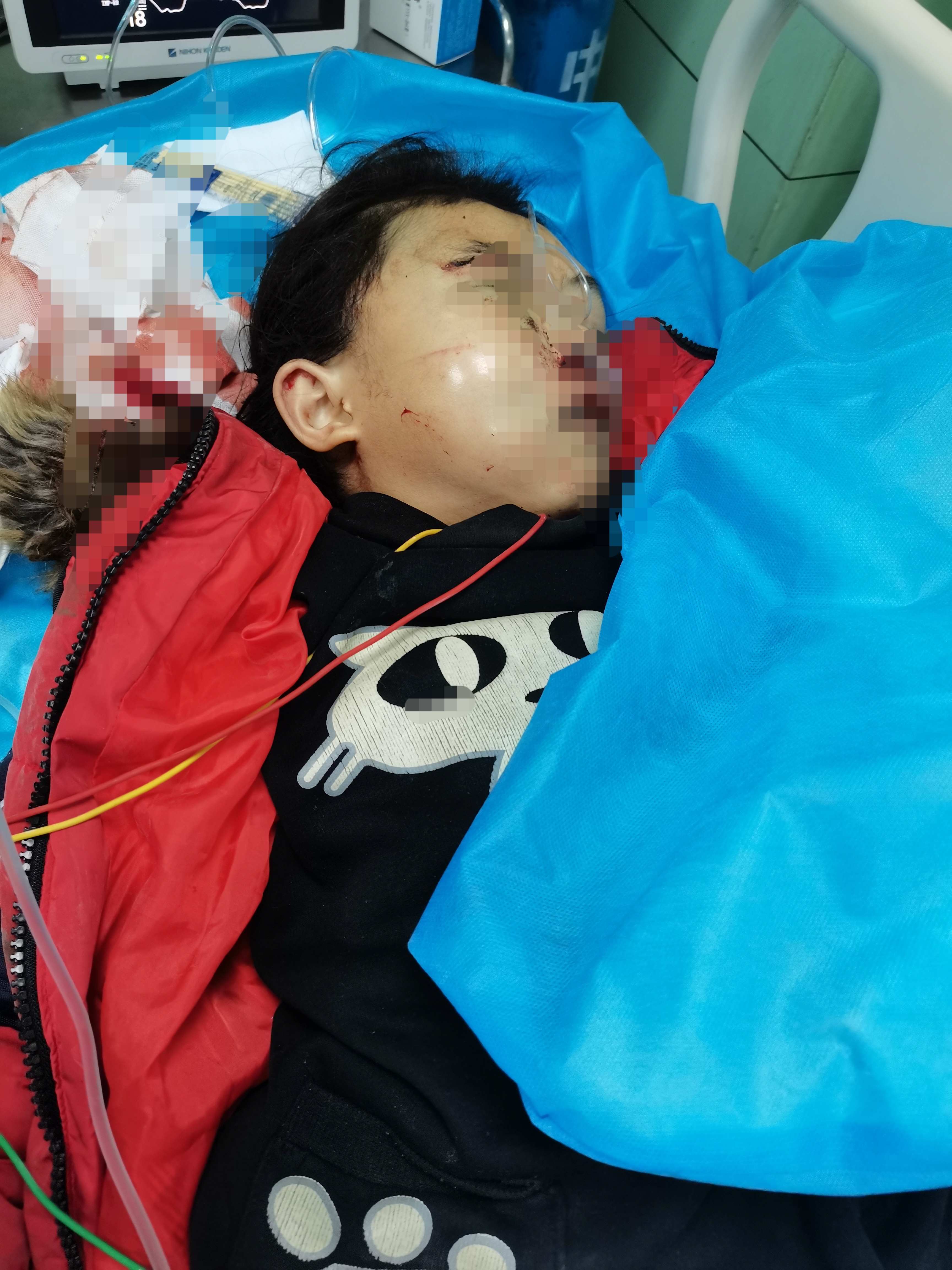 这名小女孩独自一人走路上学,过马路时被一辆公交车撞伤,伤情非常严重,意识不清,口鼻外耳道大量出血,当时已经命悬一线。