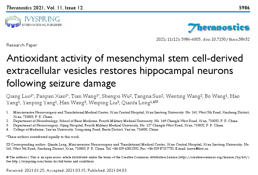 1. Qiang Luo#, Panpan Xian#, Tian Wang#, Shengxi Wu, Tangna Sun, Wenting Wang, Bo Wang, Hao Yang, Yanping Yang, Han Wang, Weiping Liu, Qianfa Long⁎. Antioxidant activity of mesenchymal stem cell-derived extracellular vesicles restores hippocampal neurons following seizure damage. Theranostics. 2021. 11 (12): 5986-6005. IF 8.58.