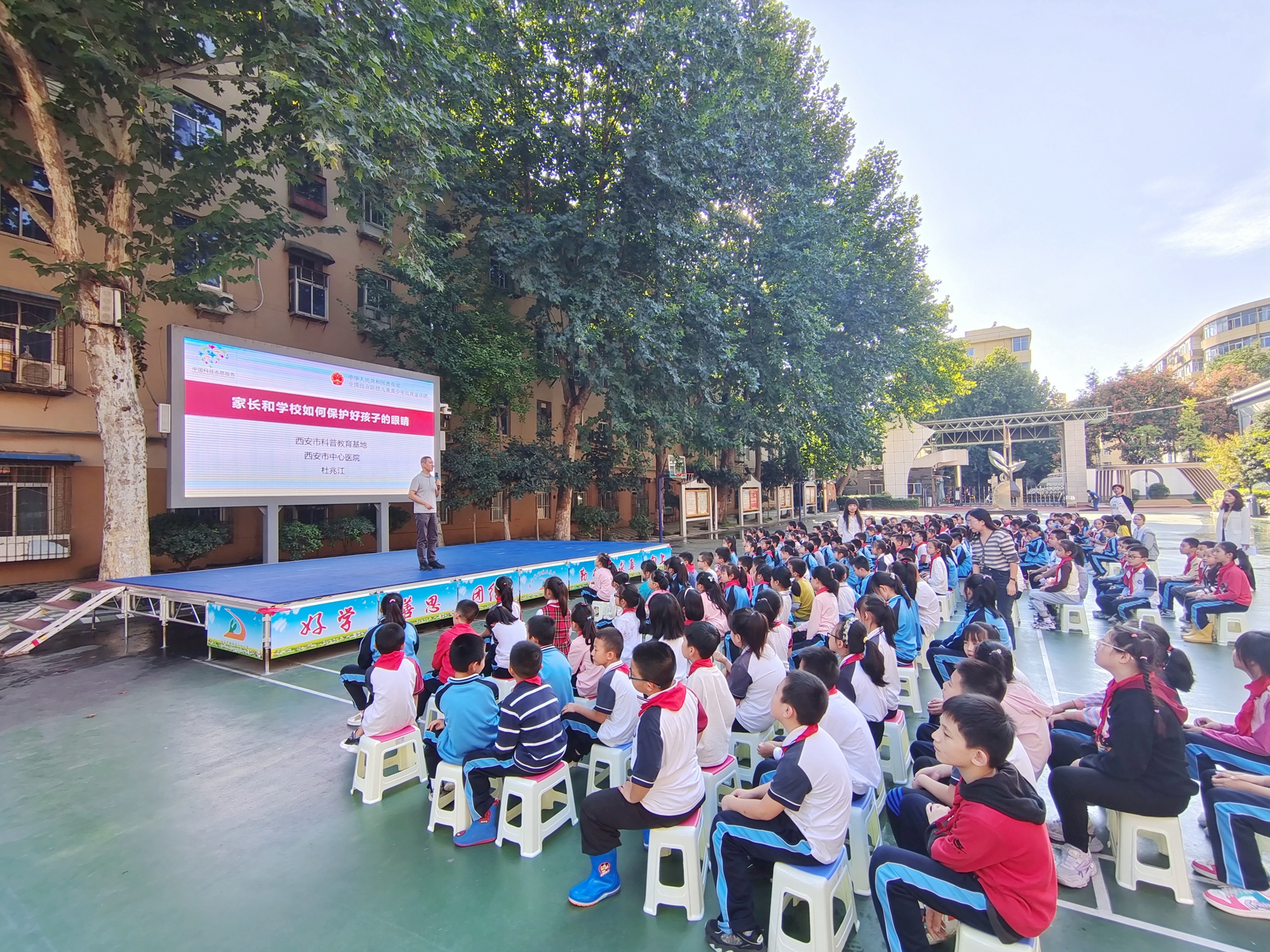 2023年9月26日,市中心医院眼科杜兆江主任作为全国综合防控儿童青少年近视专家宣讲团专家及陕西省综合防控儿童青少年近视专家团副团长,应邀走进西安市新城区东方小学,为东方小学师生及家长开展近视防控眼健康知识科普宣讲。