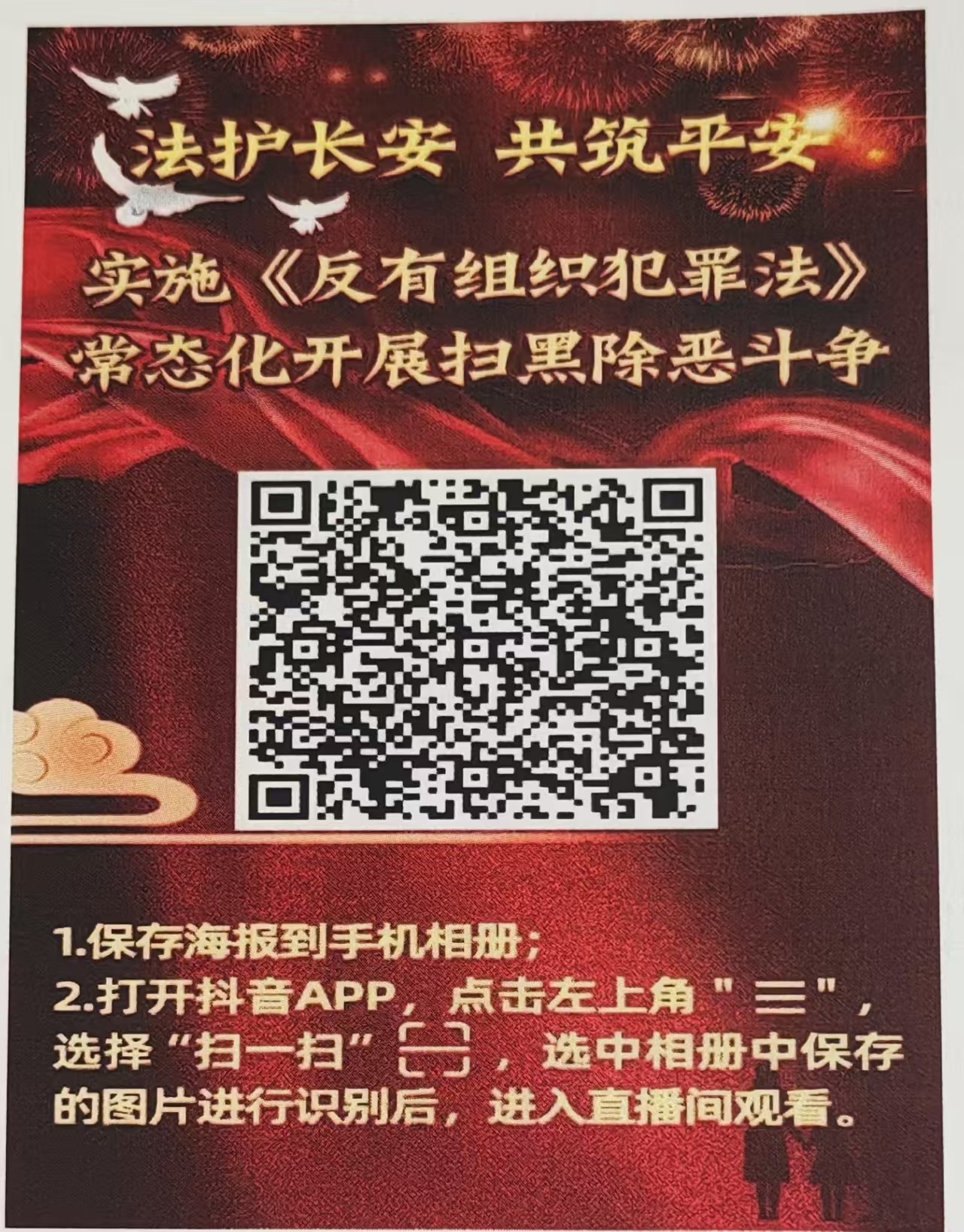 2.打开抖音 APP,点击左上角,选择“扫一扫”,选中相册中保存的图片进行识别后,进入直播间观看.锁定直播,不错过每一个守护平安的法治细节。