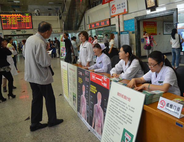 通过电子显示屏播放控烟口号,制作控烟宣传易拉宝,摆放控烟宣传展板、宣传彩页等多种形式宣传控烟、戒烟知识、目的就是向广大患者及市民宣传吸烟有害健康知识,使广大群众充分认识到烟草对健康造成的严重危害,并欢迎有戒烟意愿的吸烟者到戒烟门诊进行科学戒烟,从而走向成功之路。