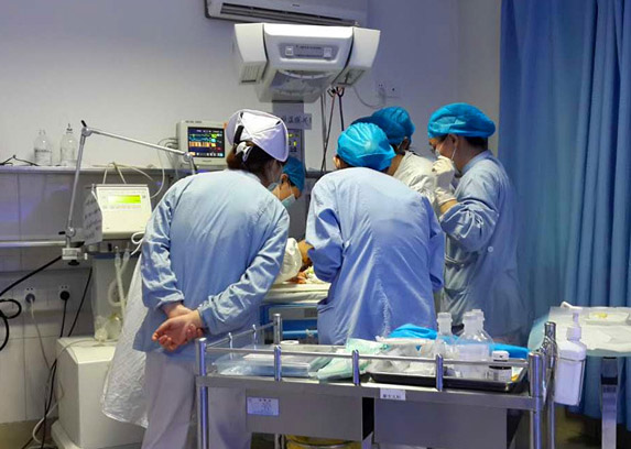这名患儿一个月前在外院出生,当时宫内窘迫、胎粪污染,出生后严重窒息,生命垂危,在出生医院就地气管插管,气囊人工通气下,由120紧急转入市中心医院新生儿科。入院后新生儿科立即用呼吸机高频通气,拍胸片提示患儿肺部情况严重,除了胎粪吸入,还并发气胸,新生儿科立即请胸外科行胸腔闭式引流抽气减压,继续呼吸机通气支持等,患儿病情缓解,呼吸衰竭纠正,继续治疗后终于稳定,逐渐好转,撤离呼吸机,拔除胸腔引流管,继续吸氧,营养支持。由于抢救及时、治疗方法得当,宝宝恢复的很理想,没有造成缺氧脑损害等严重后遗症,患儿住院一个月后康复出院,现在健康活泼,精灵帅气。元宵节当天,父母带孩子来体检,特地到新生儿科来看望抢救治疗和陪护过宝宝的医护人员们,宝宝一家和所有医护人员都非常开心!