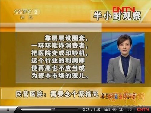 不可否认,随着中国经济结构性调整,医疗作为未来最具潜力的服务性行业之一,面临巨大的发展机遇。民营资本的进入对于提高行业竞争力,对于改变医疗资源稀缺、老百姓就医难的现状,也发挥了积极的作用。正因为如此,各路风投和私募对医疗行业情有独钟,许多民营医疗机构成为了资本市场上的明星。但是,在民营医疗行业迎来爆发式增长的时候,它的盈利基础却值得警惕。如果像节目中曝光的那几家民营医院一样,靠层层设圈套,一环环欺诈消费者,把医院变成印钞机,这个行业的利润即使再高也不应当成为资本市场的宠儿。因为,蒙一把就行,捞一把就走,这些违背商业道德底线的经营行为,一旦和强大的资本力量结合,将强化资本市场的投机心理,给整体经济注入新的泡沫。那么,民营医疗市场如何健康发展?那些已经在盈利和社会效益之间找到平衡的医院,又是怎样的运转模式?欢迎明天继续收看调查
