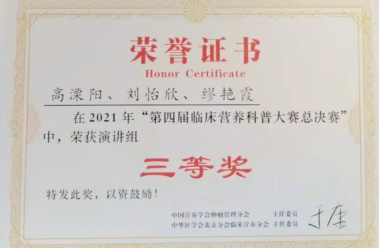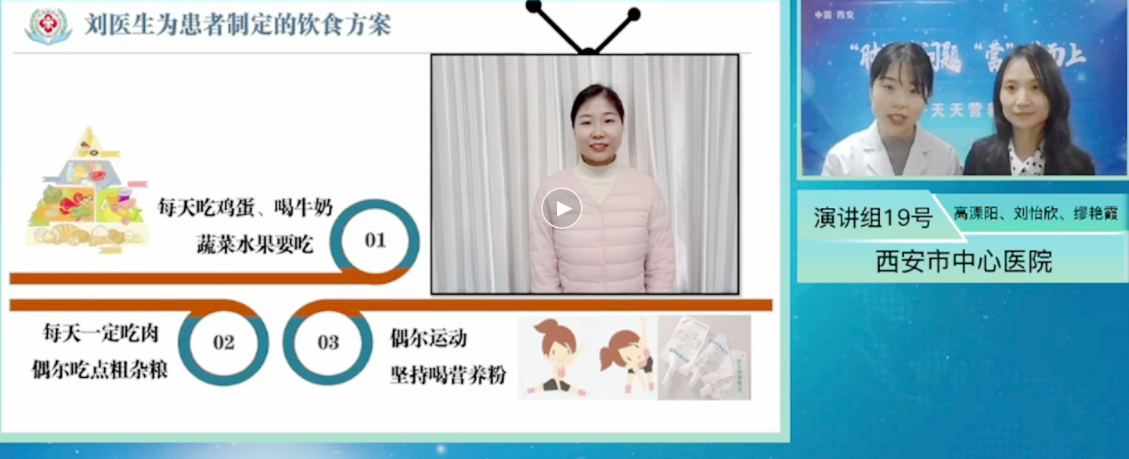 2021年12月17日,色花堂 营养科代表陕西省参加全国总决赛。自陕西省赛结束后,营养科全体人员再接再厉,将省赛中积累的演讲经验融入作品,增强了作品的流畅性。同时,增加体现作品背景的海报、增加更有吸引力的自制小道具、增加更具说服力的录像内容,不断提高作品质量,力求在全国赛场上,展现中心医院营养人追求卓越、不断创新、勇于担当的社会形象,最终,经过激烈角逐,在决赛的24个演讲作品中,荣获全国三等奖。