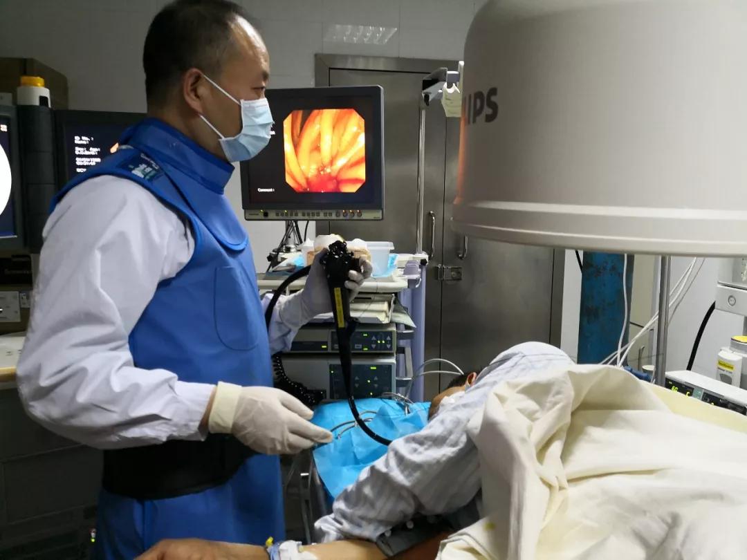 病情如火情,如不能尽快缓解梗阻,患者肝功将进一步恶化,甚至出现肝功能衰竭、亦有并发急性胰腺炎的风险,但因患者特殊的解剖结构,给内镜下的治疗带来了意想不到的难度,所有既往术者内镜下右手完成的动作技术都要交给左手来完成,且患者乳头壶腹部肿瘤从影像学上来看已造成十二指肠环受浸,僵硬变形、正常情况下都可能会造成进境困难,现在若左右手交换完成则难度更大。怎么办?患者的生命高于一切!科室很快成立了治疗小组,联合普外一科,麻醉科对各种治疗方案进行了权衡分析,最总讨论意见认为:ERCP对患者创伤最小,且不改胆汁正常的循环途径,最大限度改善患者消化功能,虽然左右手交换进行ERCP操作,我们从未尝试过,但古有“左右互搏”比武,今有“左右互搏”救人。