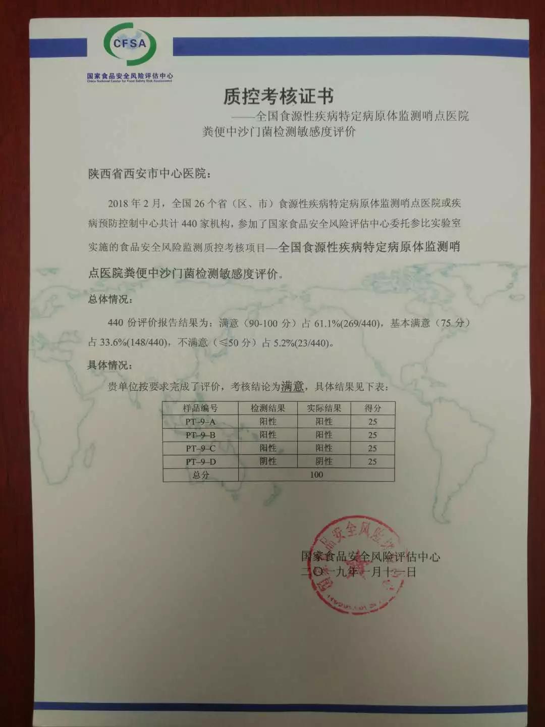 近日,在全国食源性疾病特定病原体检测哨点医院粪便中沙门菌检测敏感度评价中,色花堂 检验科以满分成绩荣获“质控考核证书”。朱建伟与李楠两位同志获得“优秀个人奖”。
