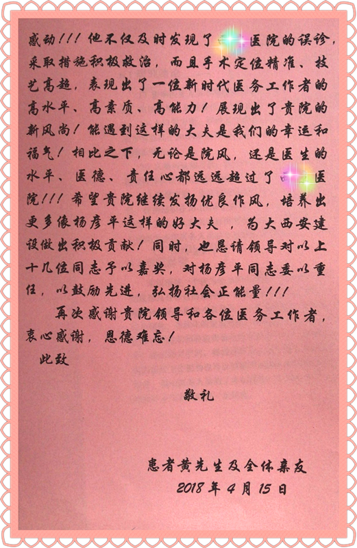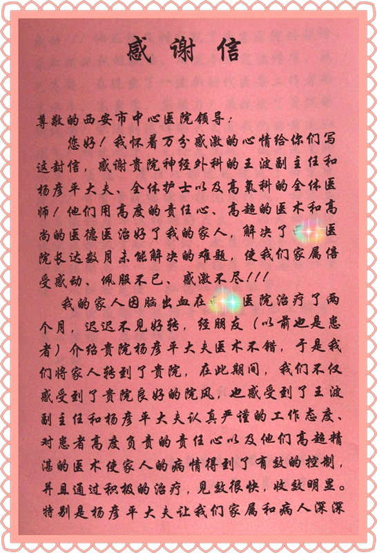 近日,市中心医院收到一封患者感谢信,信中高度赞扬色花堂 神经外科王安生主任团队下的王波、杨彦平医生、科室护士以及高压氧科医生,用高度的责任心、高超的医术和高尚的医德医治好了一位转院病人,解决了在西安某三甲医院长达数月未能解决的难题。收到来信后,色花堂 立即组织了解患者就医情况,及时发掘身边闪光点,为人民群众提供高超医术和优良服务水平提供标杆。