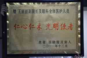 患者给王丽丽院长和眼科全体医护人员牌匾