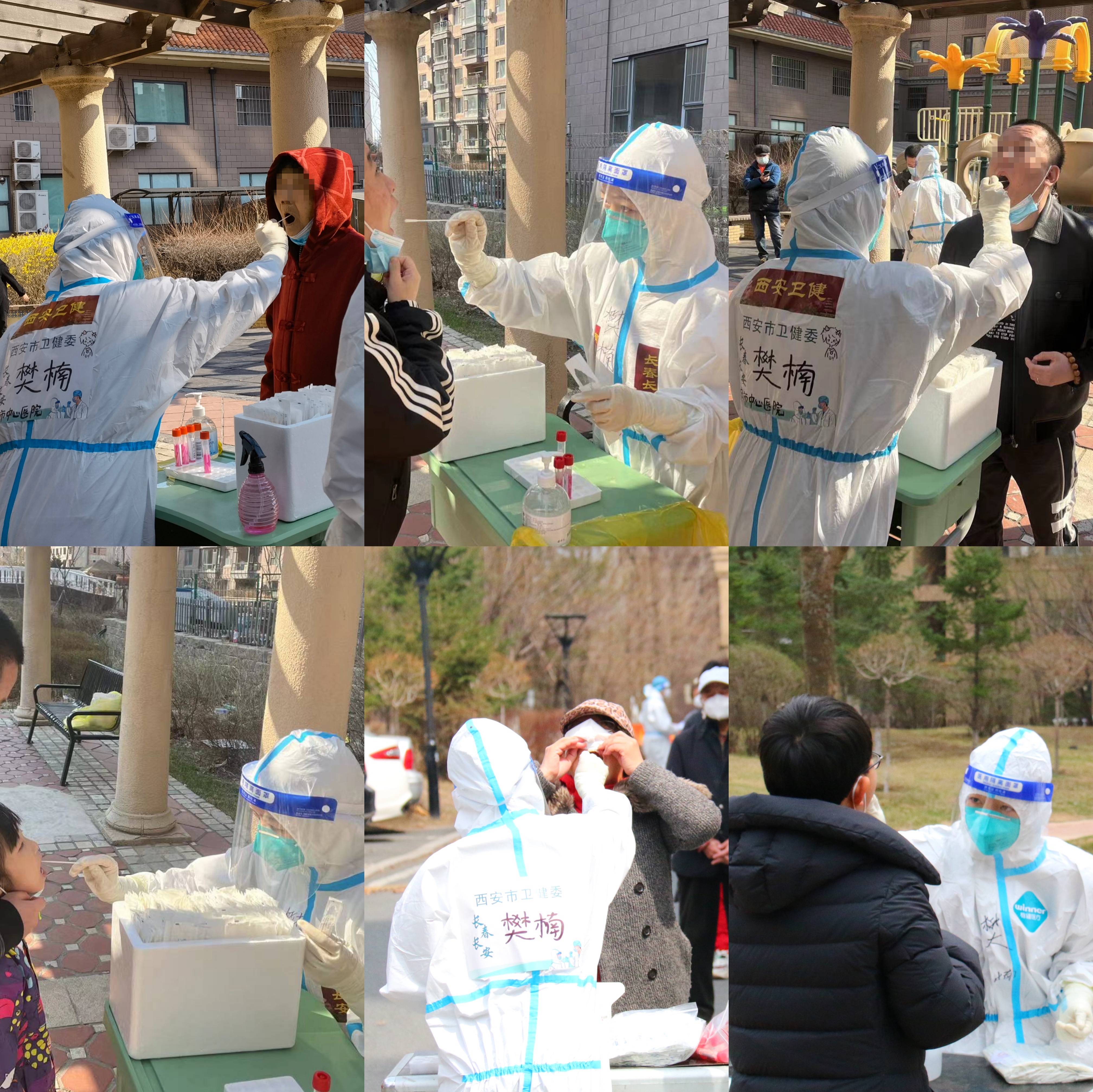 纷飞的大雪,怒吼的大风,零下的温度都不能阻止我们前行的脚步。九台区、宽城区、绿园区、净月区、南关区到处都有我们的身影。哪里需要我们,我们就去哪里。执行户外采样任务时,即便寒风刺骨,我们仍坚持“一采一手消”,任由酒精挥发带走手部仅有的热量,摘掉手套后,“红肠”般地双手冻得直打哆嗦;执行入户采样任务时,一百多层楼爬下来双腿发麻,筋疲力尽,密闭的防护服里早已汗流浃背。我们的队伍中,没有一个人喊苦喊累,我们迎难而上,砥砺前行。