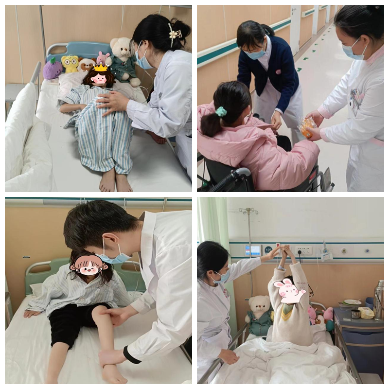 责护组长李方也是看在眼里,急在心里,这么美好的年龄怎么能就这样一辈子在床上度过呢?没有知识,怎么在社会上立足,妈妈日渐老去,谁来照顾......经过和主管医生沟通,与康复师一起为小玥玥制订了康复计划,每天责护组的护士姐妹一有空就不定时给予康复训练,给妈妈腾出时间治疗和休息。特别是实习的小哥哥、小姐姐也帮小玥玥锻炼,利用自己的空闲时间陪小玥玥玩游戏、读书......
