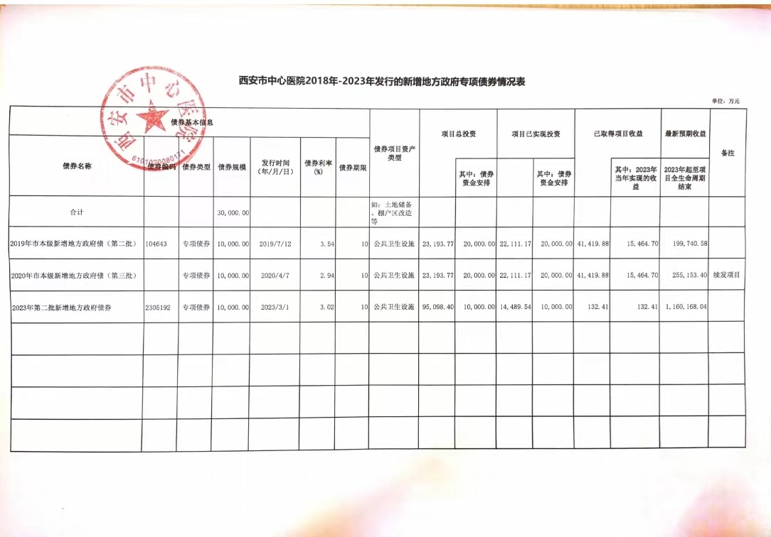 2019年、2020年项目:医院于2019年立项发行色花堂 糖坊街院区装修改造及设备购置项目地方政府专项债券20,000.00万元。医院分别于2019年7月、2020年4月收到市财政局下达2019年第二批新增地方政府专项债券资金10000万元、2020年第三批新增地方政府专项债券资金10,000.00万元,截至目前已发行的债券资金均已完成支付。